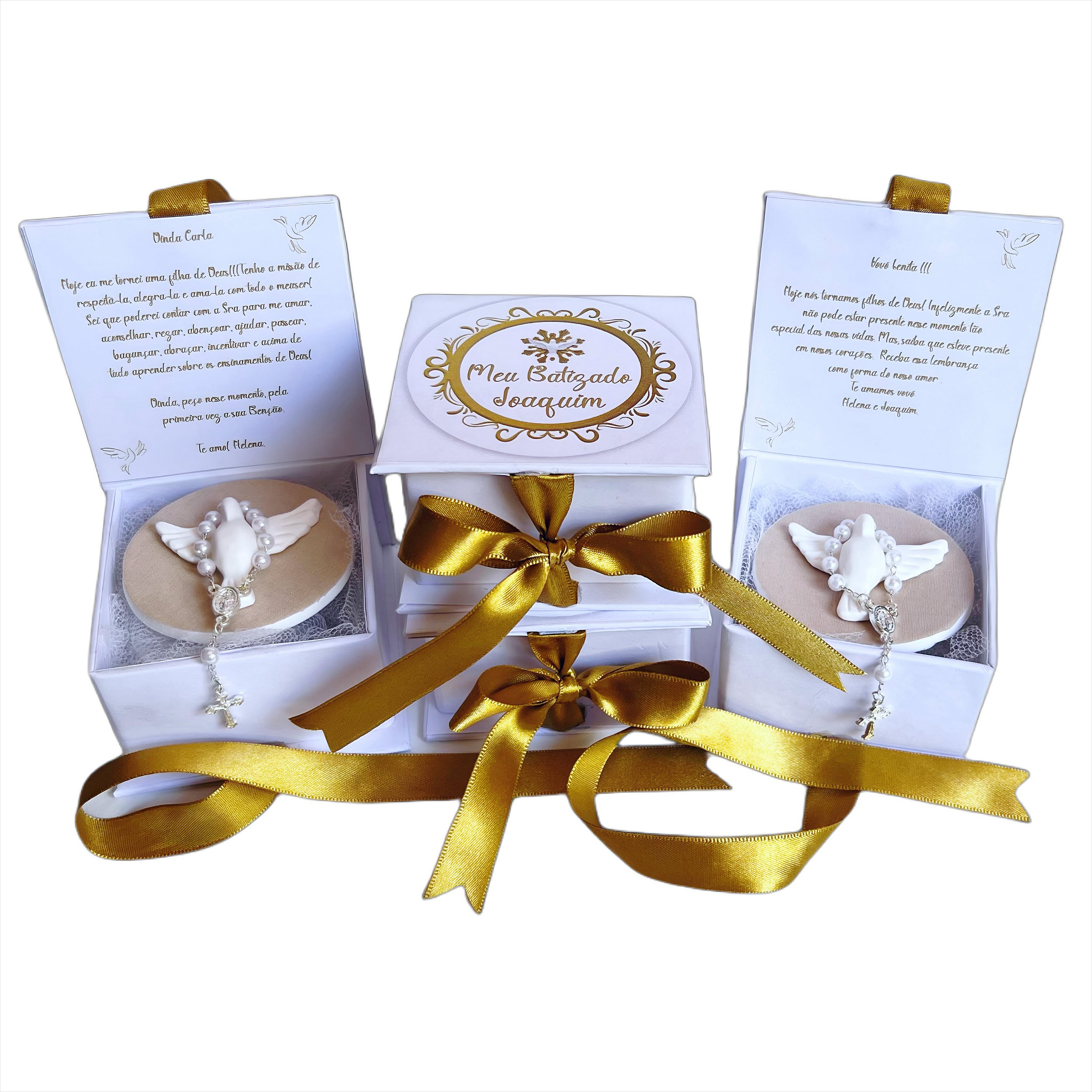 • Design: Personalizado conforme a escolha do cliente, podendo incluir nome, data do batizado, mensagem especial e/ou imagens religiosas.