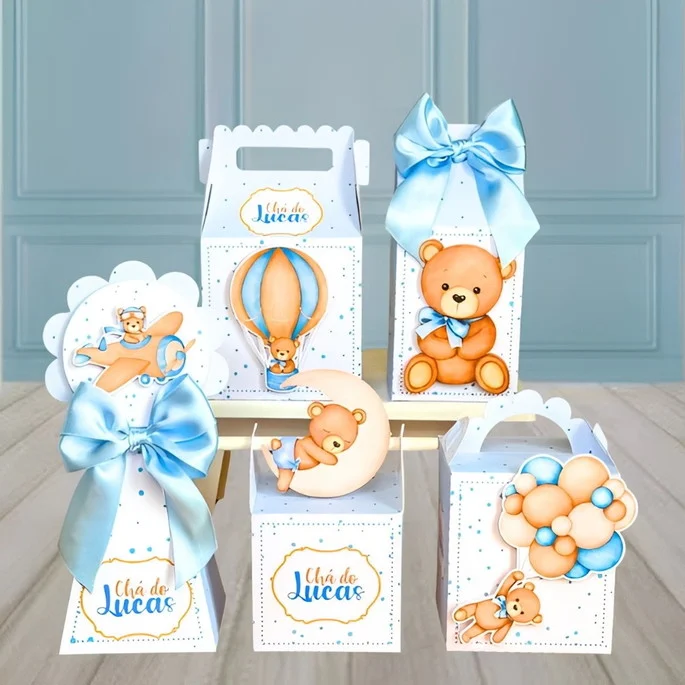 Caixas decorativas personalizadas para chá de bebê com tema de ursinho azul, ideais para lembrancinhas que encantam.