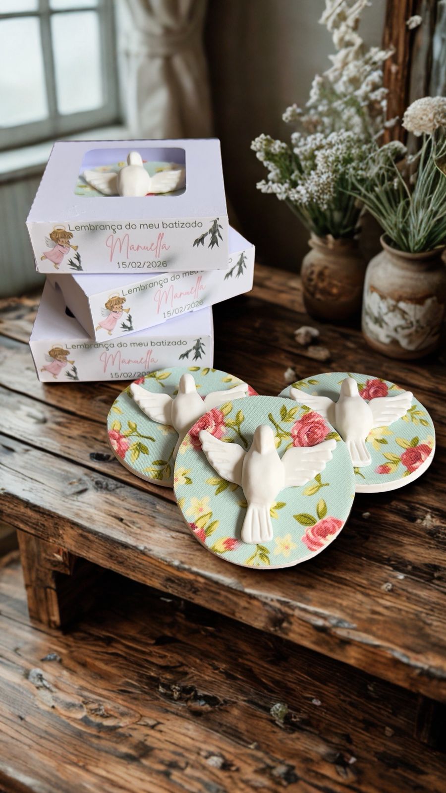 Lembrancinha em imã especialmente personalizada para celebrar o batizado, com design delicado e acabamento caprichado.