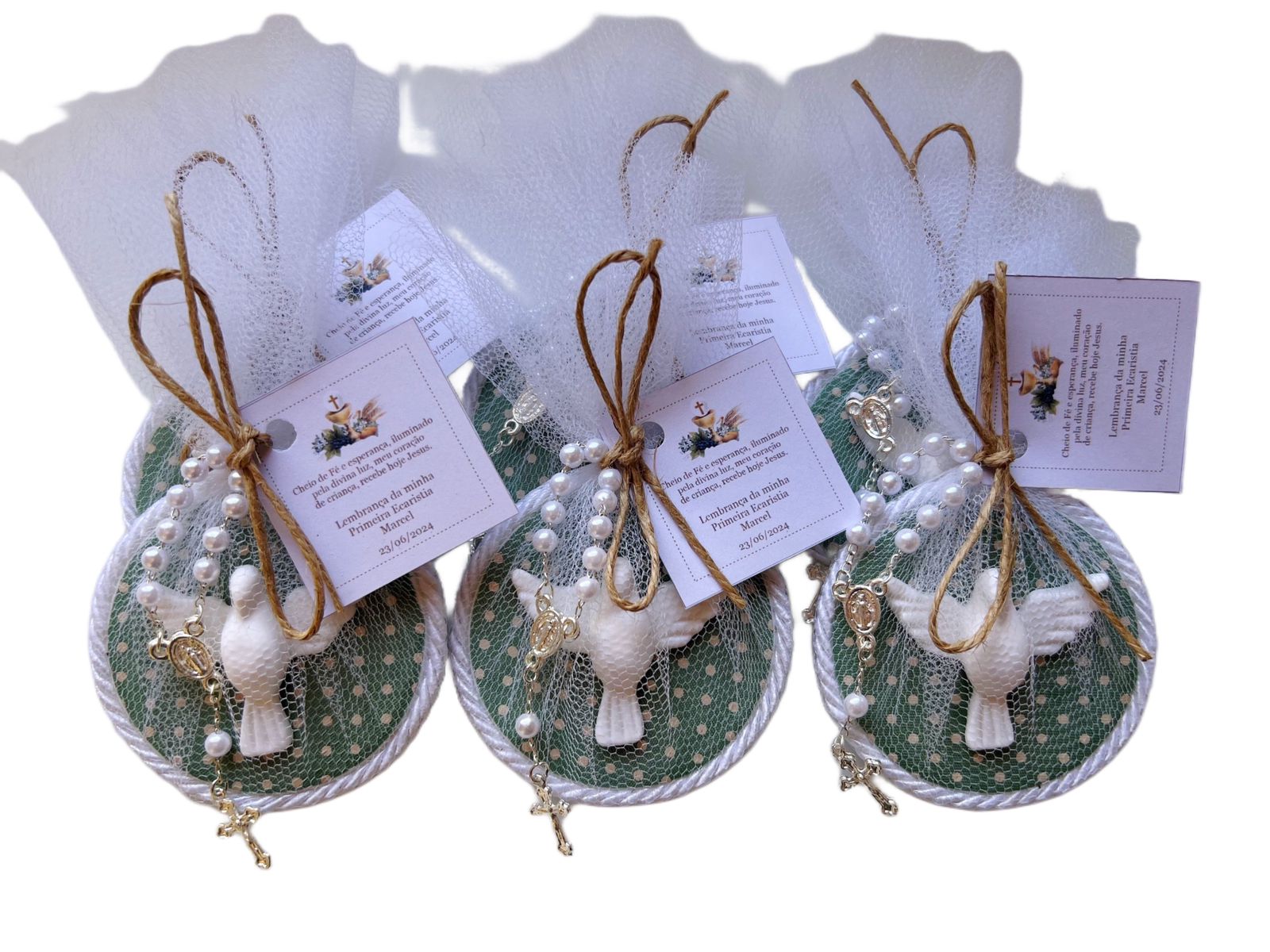 Significado: O terço representa a fé e a espiritualidade, tornando a lembrancinha ainda mais significativa.
