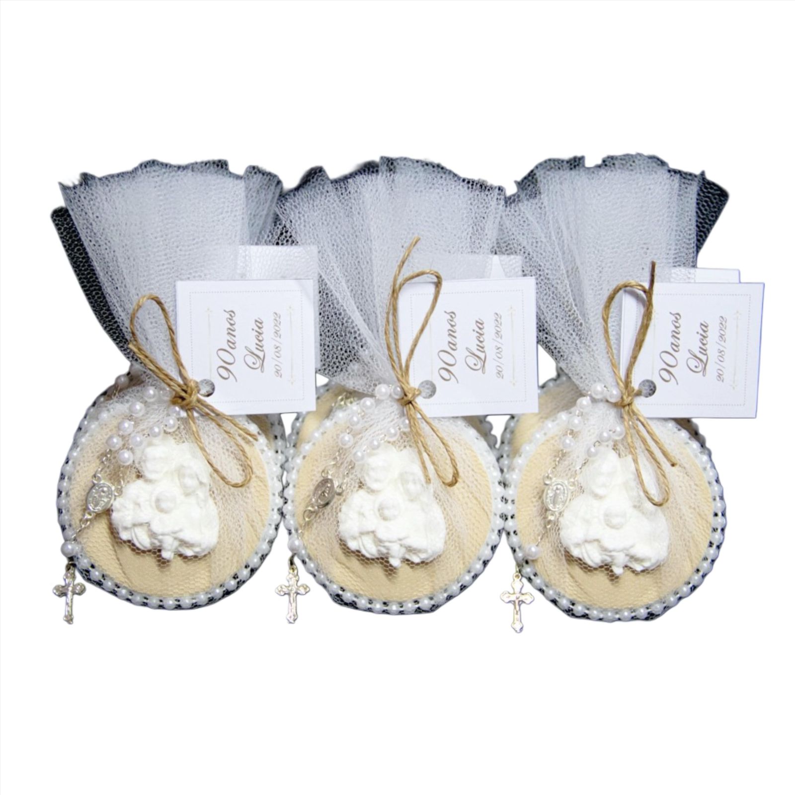 Lembrancinha de aniversário 90 anos com Ímã acompanha terço e tag personalizado, embalado no tule.